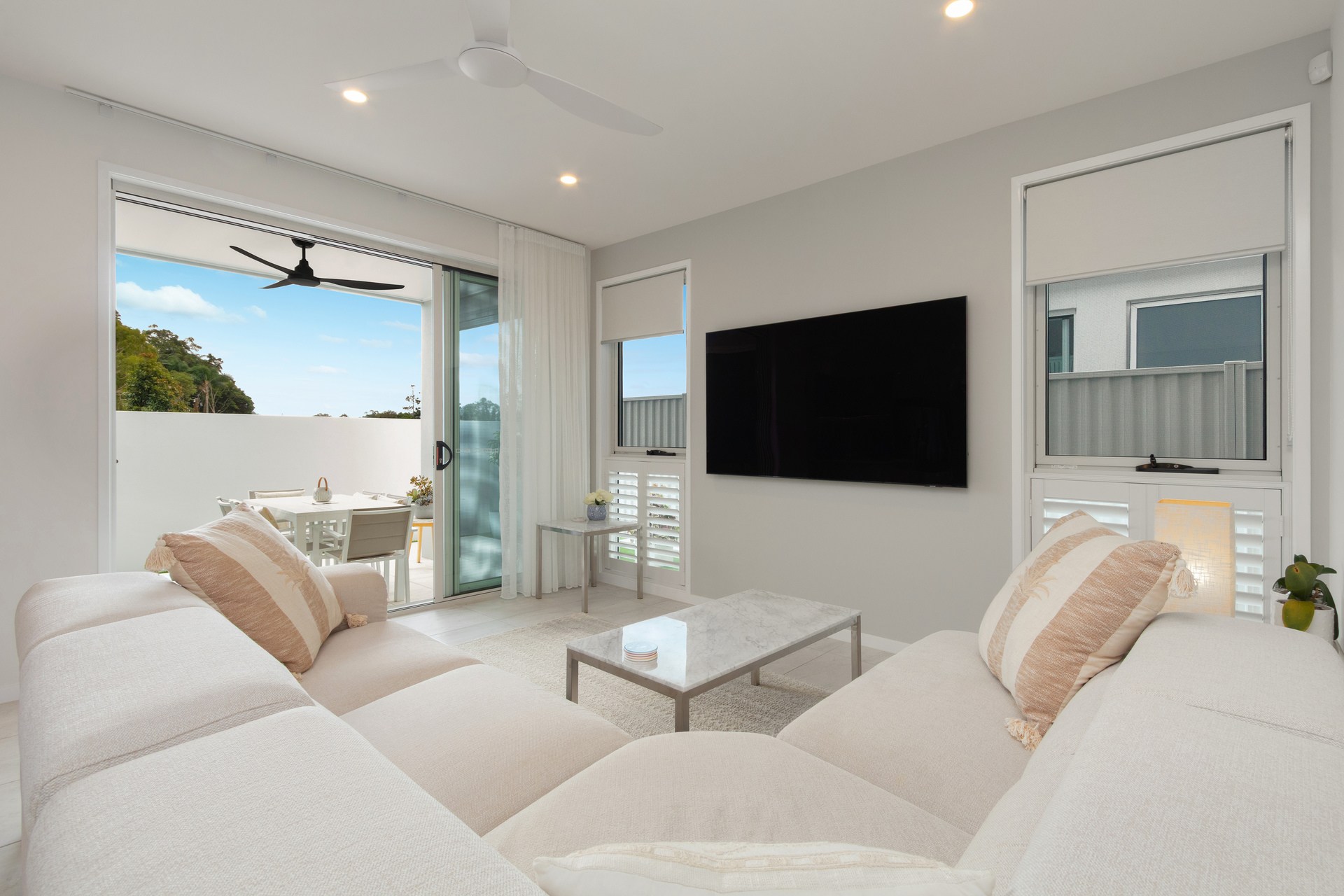 - Ducted air conditioning, plantation shutters and ceiling fans